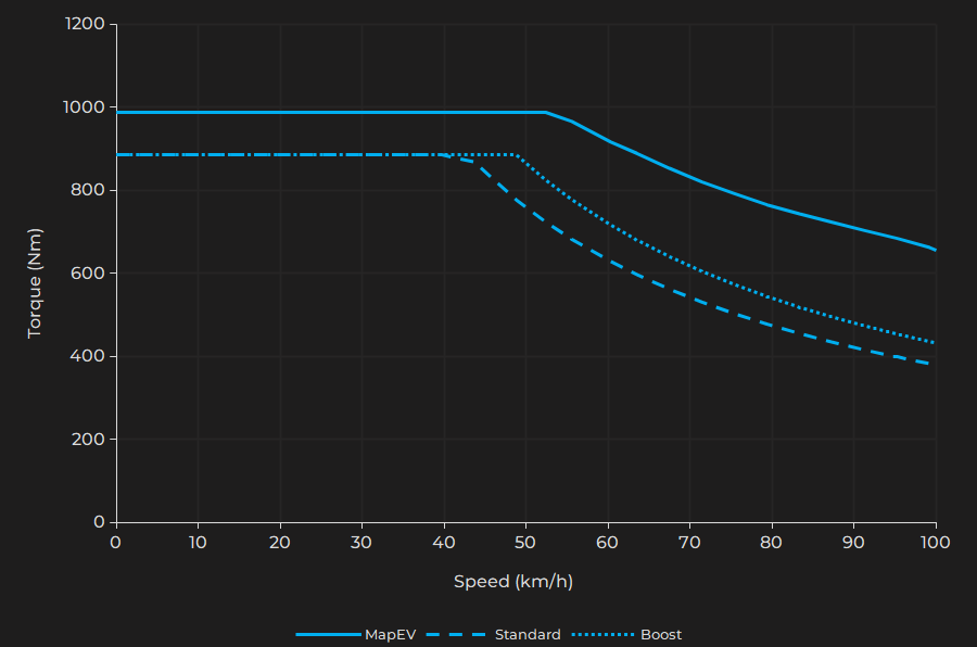 Our software includes a special function, which at wide open throttle puts the motor controllers into launch mode even during normal driving. Simultaneously the suspension is stiffened and the traction control adjusted for optimal acceleration. Without this unique function, that only we provide, it is impossible to exceed 885 Nm of torque outside of launch control.