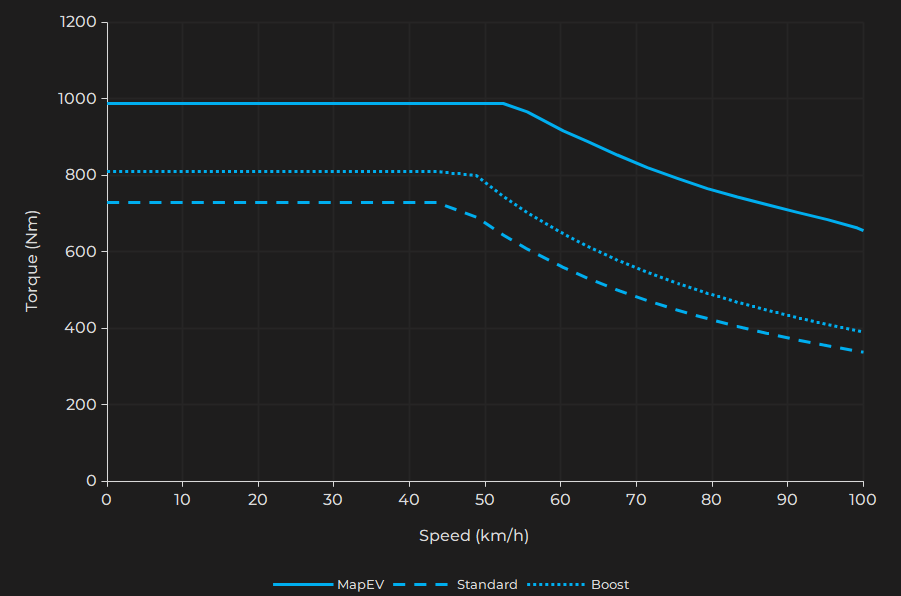 Our software includes a special function, which at wide open throttle puts the motor controllers into launch mode even during normal driving. Simultaneously the suspension is stiffened and the traction control adjusted for optimal acceleration. Without this unique function, that only we provide, it is impossible to exceed 885 Nm of torque outside of launch control.