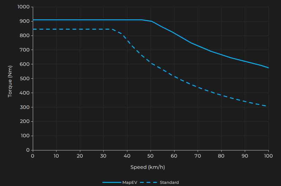 Our software includes a special function, which at wide open throttle puts the motor controllers into launch mode even during normal driving. Simultaneously the suspension is stiffened and the traction control adjusted for optimal acceleration. Without this unique function, that only we provide, it is impossible to exceed 850 Nm of torque outside of launch control.